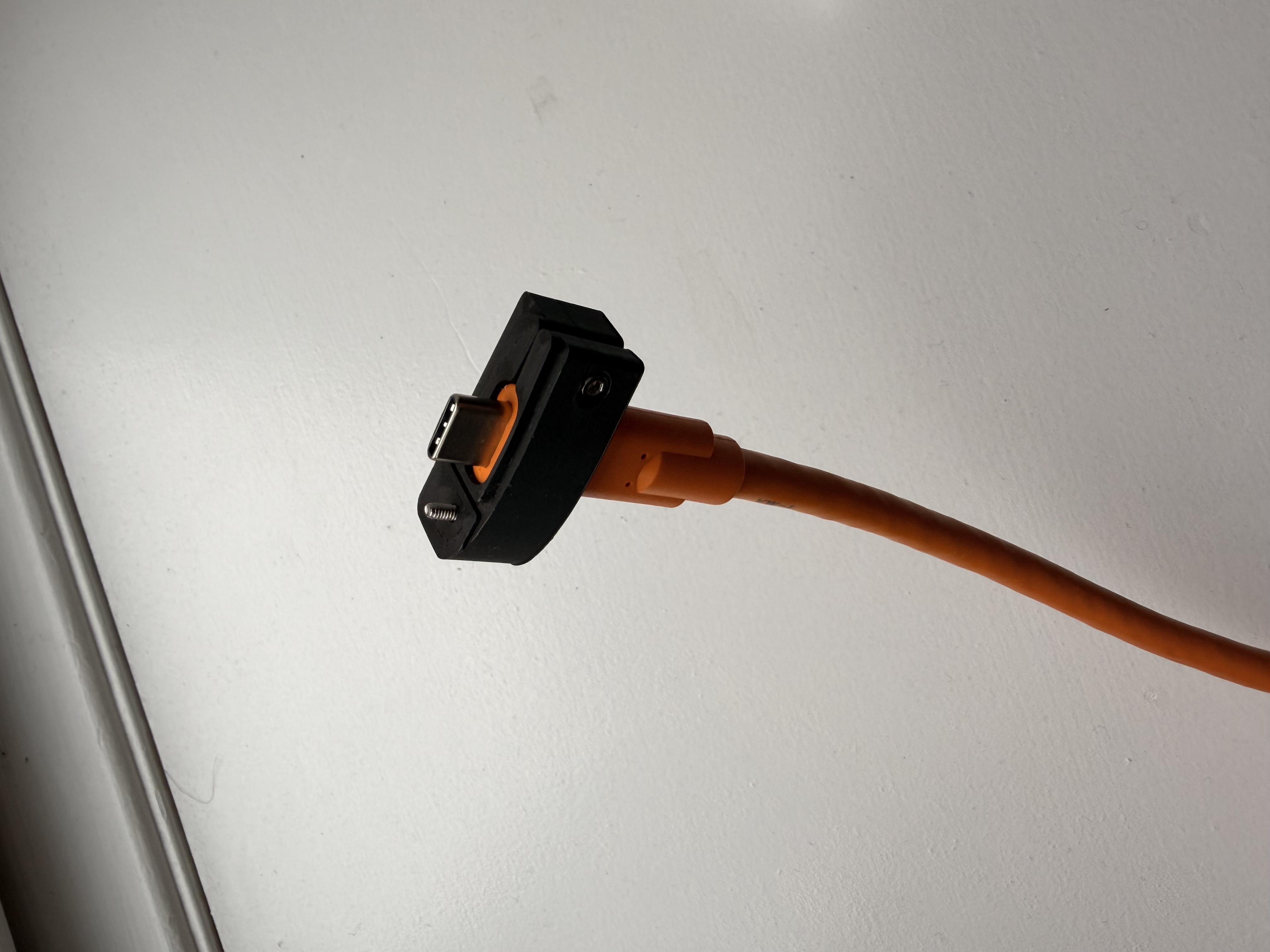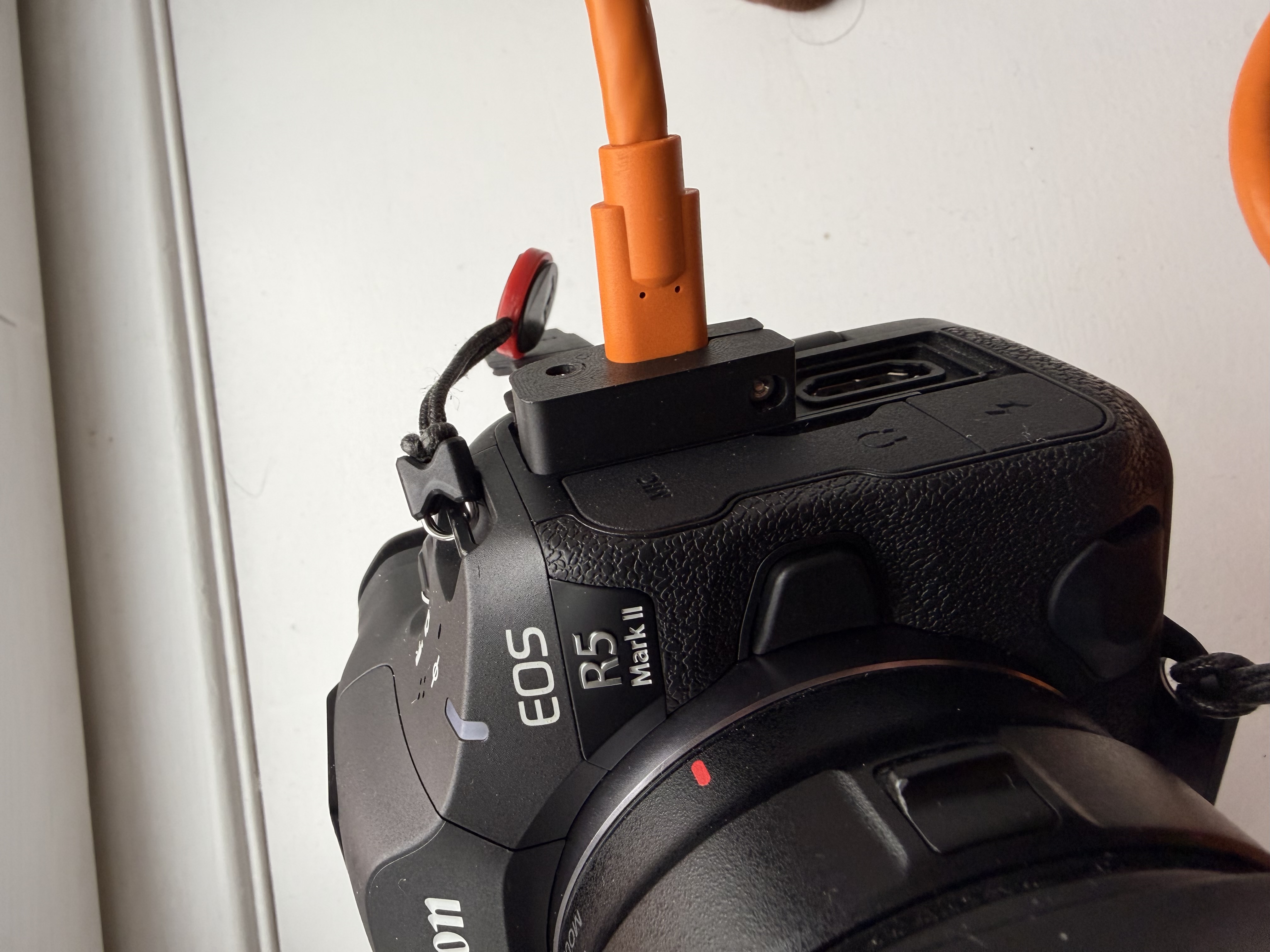 This small 3D-printed brick clamps onto the end of your USB-C cable and then screws into the side of your R5 body to securely keep the cable in place and reduce strain on the port.