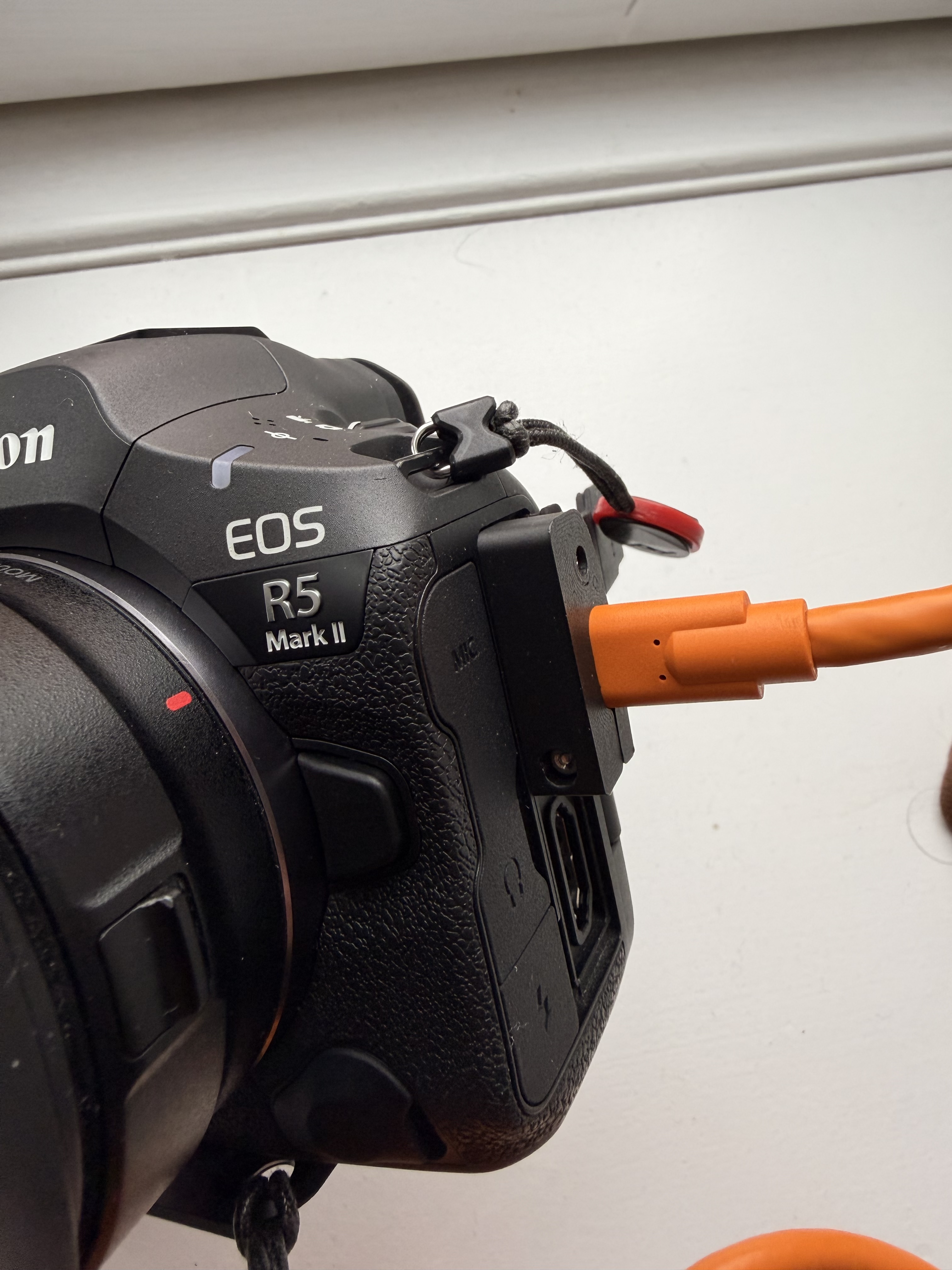 This small 3D-printed brick clamps onto the end of your USB-C cable and then screws into the side of your R5 body to securely keep the cable in place and reduce strain on the port.